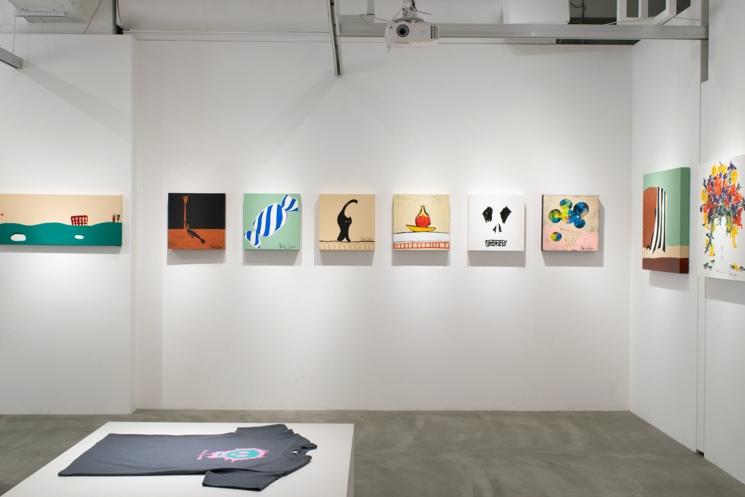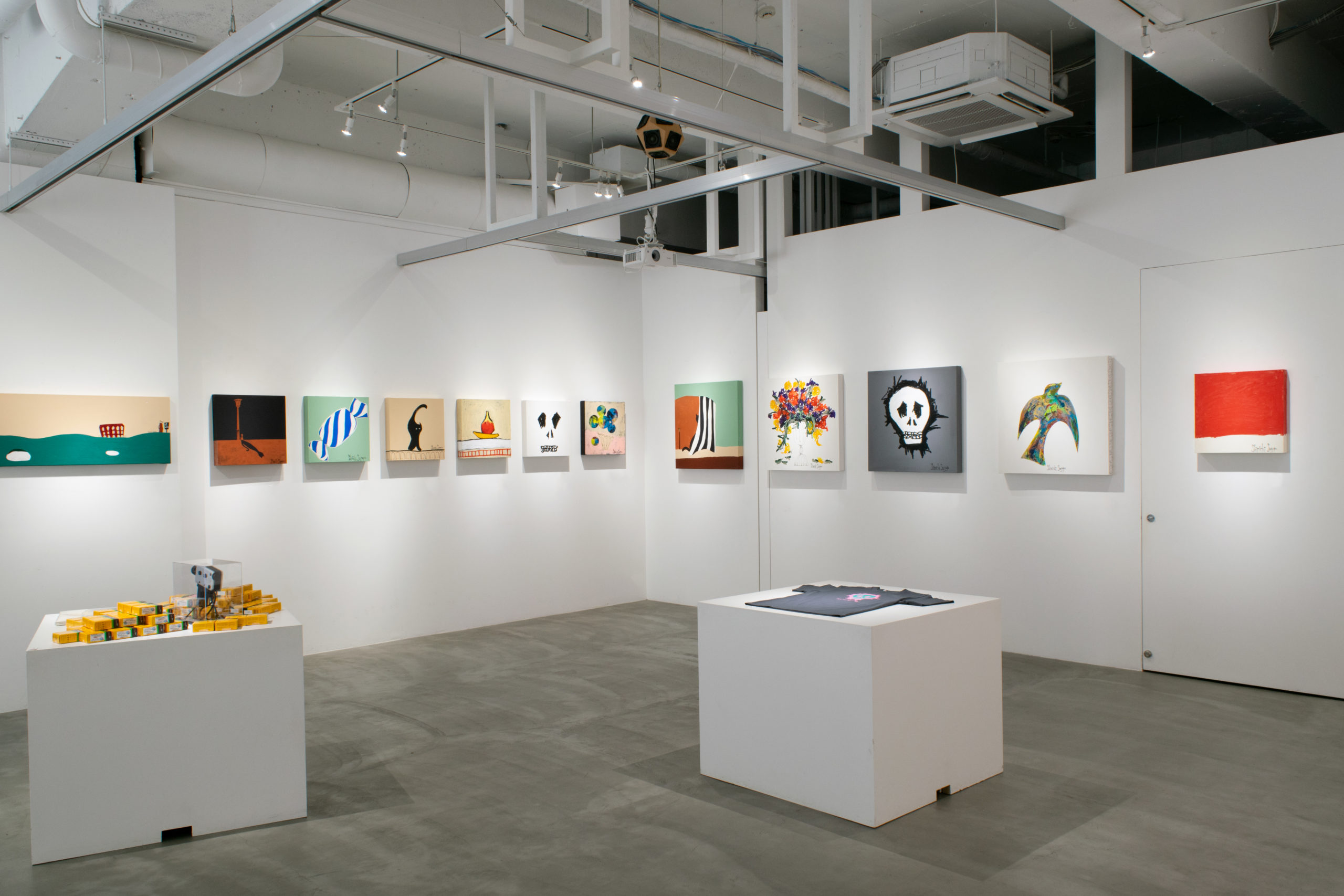 4回目となる本展では、昨年表現された力強い色彩に加え、日々の小さな出来事を照らす穏やかな作品が際立ちます。切り絵のような輪郭をまとった色や、かすれたインクの線、希望に満ちたキャンバスには、花や鳥、スカルなどが並列に描かれ、どこまでもニュートラルな菅谷の作品世界が色濃く表現されています。